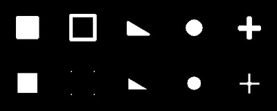 Procedure: We use an image set as shown below. The square is 50 by 50 pixels while the hollow square is 60 by 60 and 4 pixels in width. The traingle is 30 by 50 while the circle is 25 pixels in radius. On the other hand, the cross is 8 pixels wide and each arm is 50 pixels long.